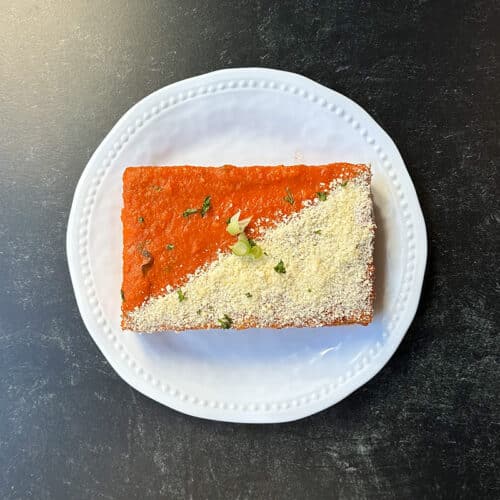 Ingredients: tomato sauce (san marzano tomato, olive oil, onions, carrots, celery, garlic, kosher salt, sugar, crushed red pepper, rosemary, thyme, bay leaves, basil), breaded eggplant (eggplant, flour, egg wash, panko bread crumbs), mozzarella cheese, parmesan cheese, dried parsley, dried oregano